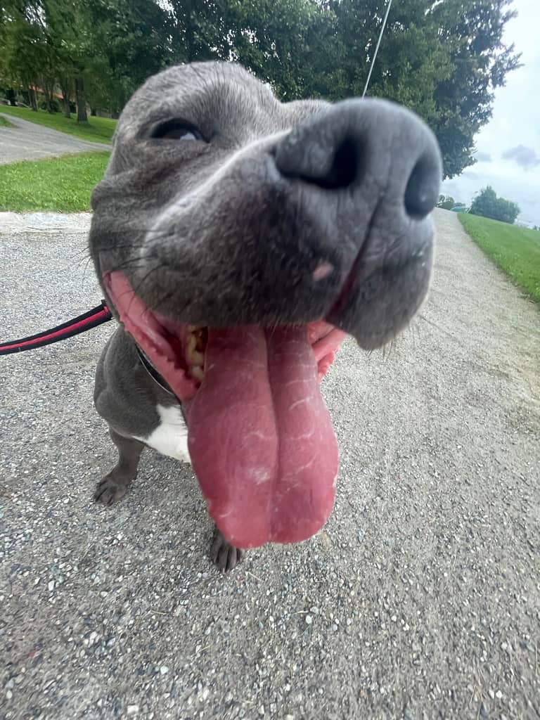 Min Staffordshire Bull Terrier er en ekte hjerteknuser – en blå skjønnhet med en tydelig hvit tegning på brystet som gjør ham lett gjenkjennelig. Han har et vennlig blikk og en kropp som strutter av energi og kjærlighet.