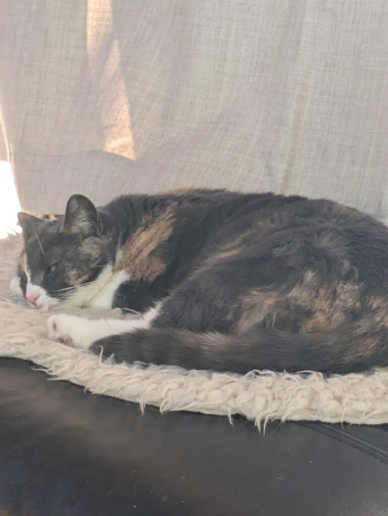 De har også en uvanlig god bestevenn: Basse, familiens Staffordshire Bull Terrier. De sover gjerne sammen i sengen hans, og du finner dem ofte krøllet sammen i en varm pelsball – katt og hund i perfekt harmoni.